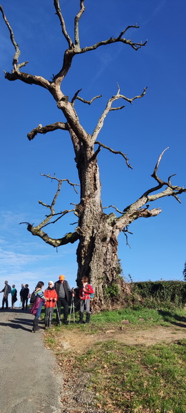 Peu de distance sur le plateau du château d’eau, puis on redescend vers un énorme chêne, mort depuis très longtemps mais donc le tronc décharné est toujours debout.