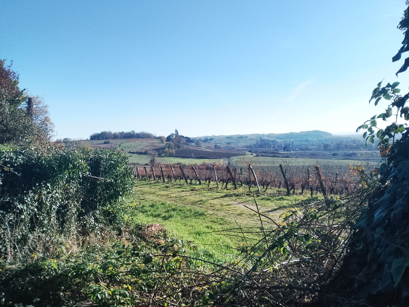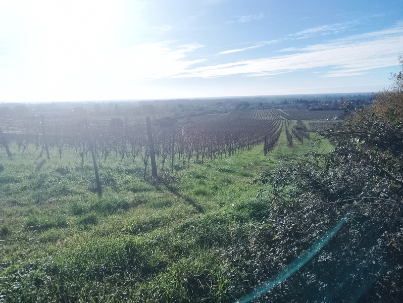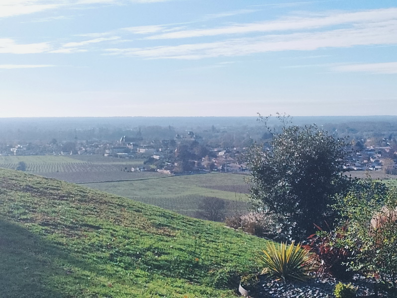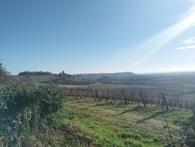 On emprunte une allée de vigne descendante pour reprendre une petite route en balcon, dominant tout le secteur de Cadillac et de Loupiac.