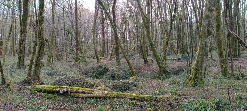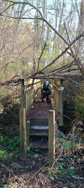 La petite route qui suit rejoint la D 671. Le tracé continue vers l’est entre friches et forêts jusqu’à un pont en bois qui a résisté à la chute d’un arbre, mais l’arbre en question est couché dessus, il faut passer presque à quatre pattes.