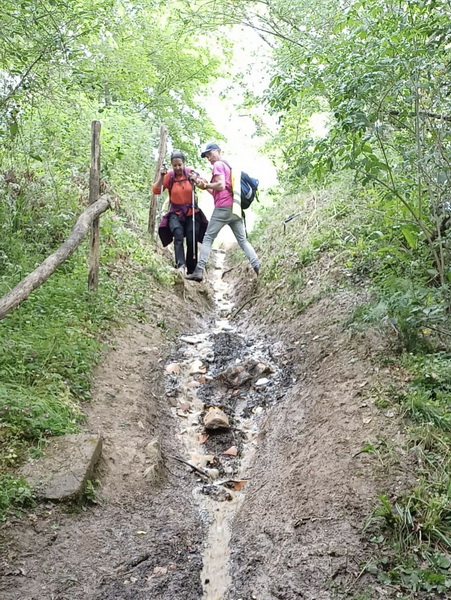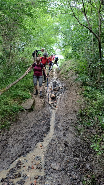 Là une canalisation d’eau fuit abondement et transforme un petit chemin encaissé en petit torrent « gadoueux », et ça, ce n’était pas prévu au programme … cela met un peu de piment pour nos randonneurs ! mais sans sortir cordes et piolets, tous vont passer l’obstacle avec brio ! Nous rentrons sur Sallebœuf par les vignes du Château Pey La Tour.