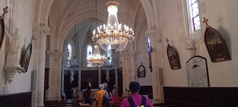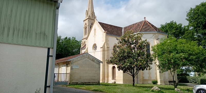 Nous revenons à nos voitures sans avoir une nouvelle fois, pour certains, admiré la belle Eglise du village : l’église Sainte Marie. Bâtie à priori en pierres blanches de Camarsac, elle a pris la place en milieu du XIXe siècles de deux autres églises de la commune devenues vétustes. Contrairement à la plupart des Eglises elle est orientée Nord-Sud et non pas Est-Ouest sans que l’on en connaisse la raison. Bien qu’appartenant à un « petit village », elle est richement dotée en statues, vitraux, et lustres dont deux furent offerts par la famille Eiffel résidente un temps sur Sallebœuf.
