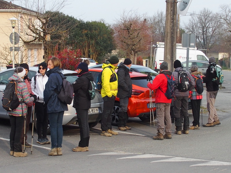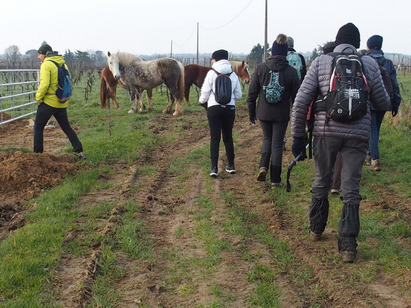 Temps frais et ciel voilé attendent ce dimanche matin les treize représentants de Rando Tabanac qui s’élancent sur la rue Léo Drouin avant de prendre à droite la rue de l’Eglise puis la route de Fisson. Une centaine de mètres plus loin nous la quittons pour suivre un chemin herbeux qui court entre les parcelles de vignes.