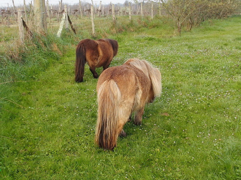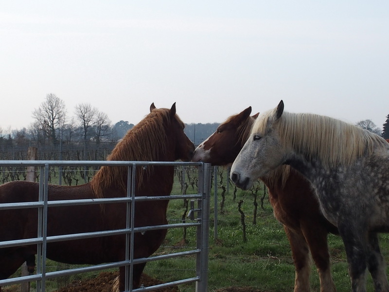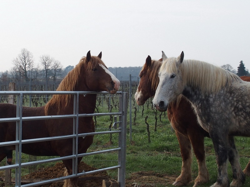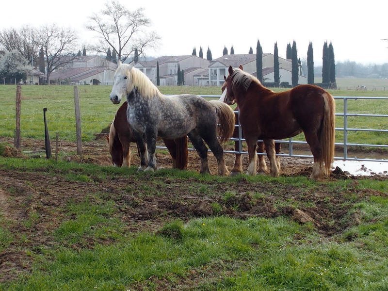 Nous retrouvons au bout des rangs la route de Fisson que nous empruntons sur trois cent mètres avant de prendre à droite un chemin sur lequel se promènent trois superbes Percherons, tandis qu’un autre cheval et deux poneys les regardent (envieux ?) depuis leurs enclos.